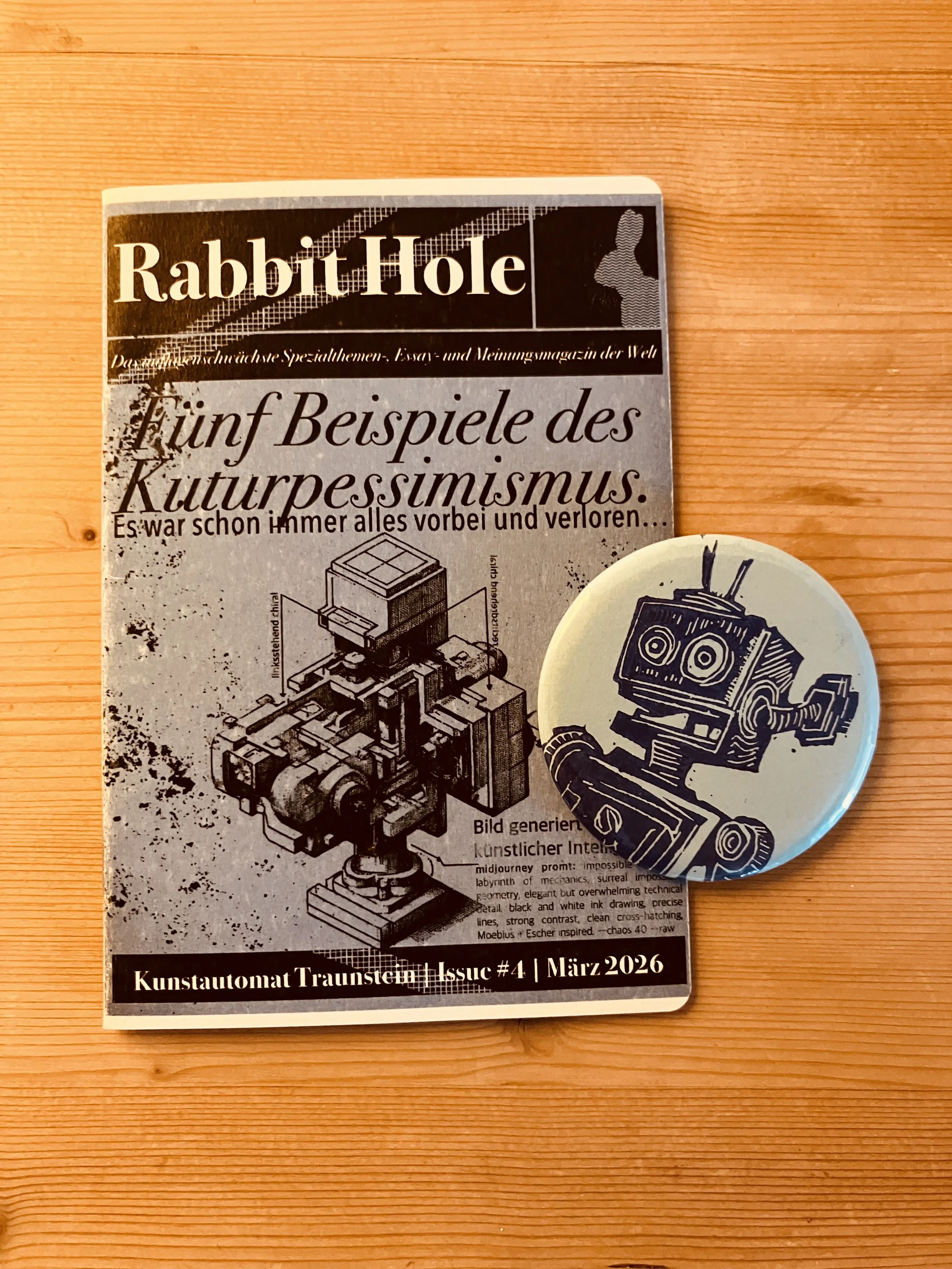 rabbit hole ist ein unabhängiges Essay- und Meinungsmagazin für Spezialthemen, Gedankenspiele und intellektuelle Abwege. Jede Ausgabe folgt einer Idee, die harmlos beginnt und unerwartet in tiefere Zusammenhänge führt.